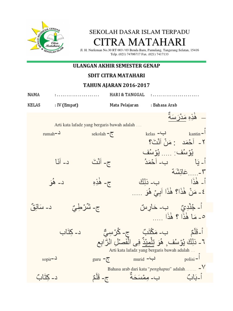 1.1 mensyukuri kesempatan dapat mempelajari bahasa arab sebagai bahasa pengantar komunikasi internasional yang diwujudkan dalam semangat belajar. Soal bahasa arab sd kelas 4full description. / tulisan arab yang benar untuk arba'atun adalah. Jika anda memiliki pertanyaan yang berkaitan dengan tema di atas, atau ingin bertanya.